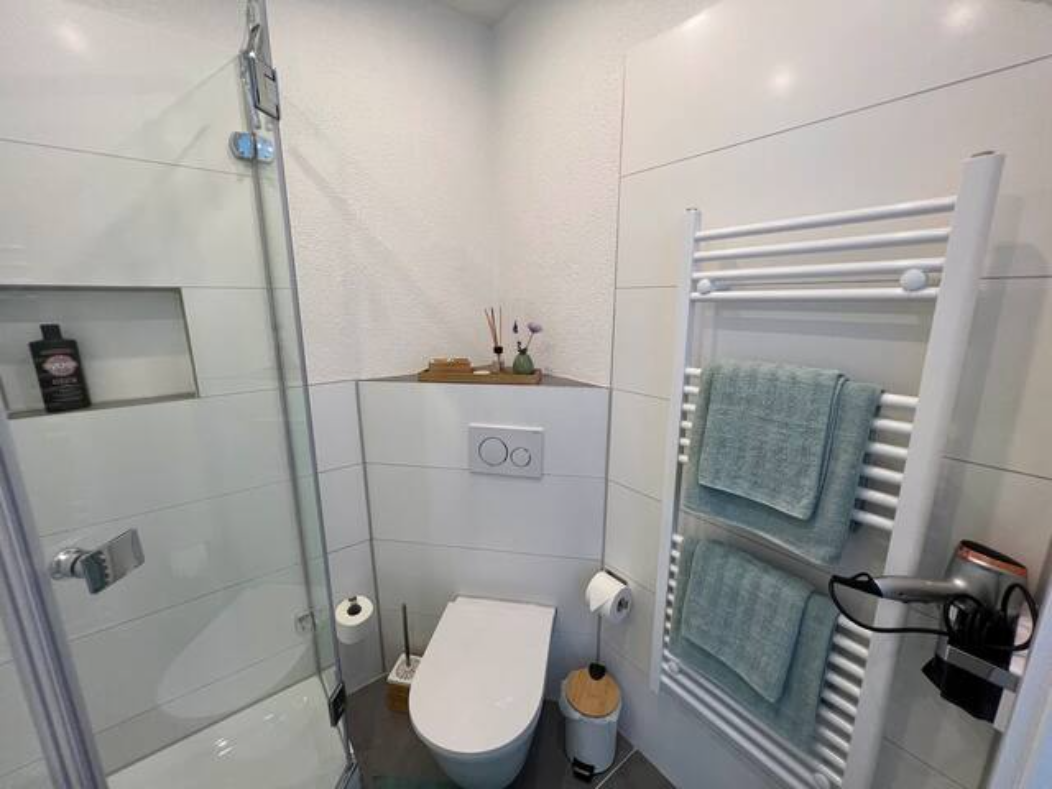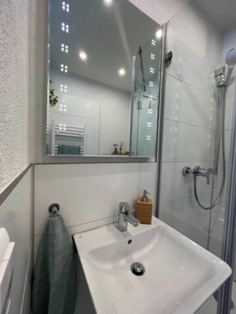 – Modern eingerichtetes Bad mit Dusche, Waschbecken, WC, Fön und Handtücher