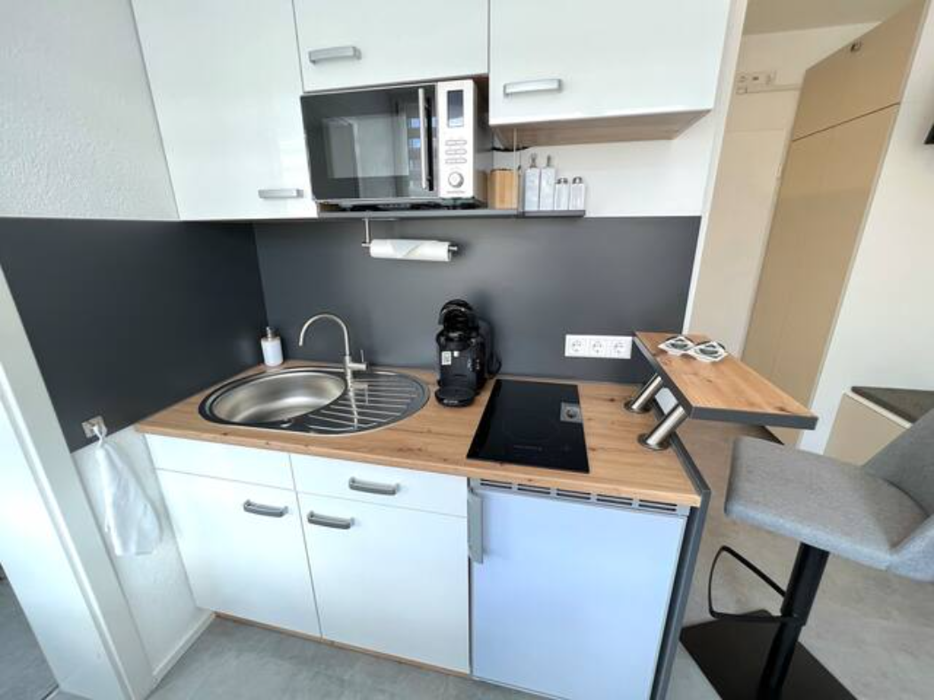 Ihnen steht eine vollständig eingerichtete Küchenzeile mit Essplatz, Spülbecken, Kühlschrank, Herd, Mikrowelle, Kaffeemaschine und weiteren Küchenutensilien zur Verfügung. Sogar Töpfe und Geschirr sind bereits vorhanden.