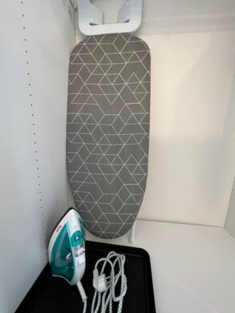 – Schrank, Sitzbank, Garderobenhaken, Spiegel, Bügeleisen und Bügelbrett